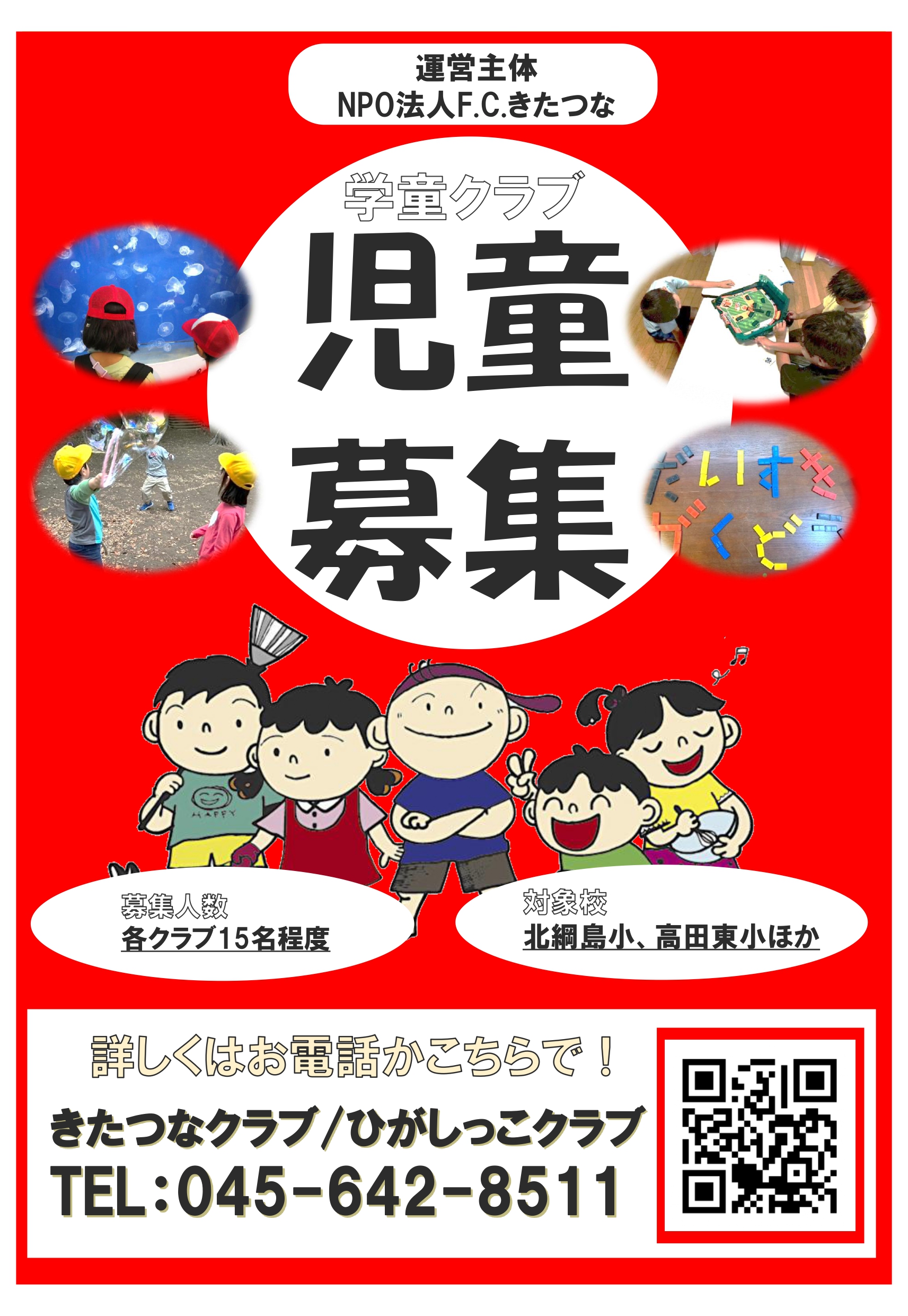 こんにちは!NPO法人F.C.きたつなです! 【2026年度入会説明会のご案内】 2026年度入会説明会は下記の日程で開催予定です。 詳細、申込みフォーム等は後日更新予定となります。 ◎きたつな学童きたつなクラブ (対象小学校:北綱島小学校ほか) ①11/29(土) 10:30~11:30 ②12/ 6(土) 16:00~17:00 ◎きたつな学童ひがしっこクラブ (対象小学校:高田東小学校ほか) ①11/29(土) 16:00~17:00 ②12/ 6(土) 10:30~11:30 入会説明会のお申し込みはコチラ ![]() 【わたしたちの目指していること】 みんなでみんなの子どもを育てよう! 地域に根差した『子育て拠点』として、子どもたちの育成を支援します。 ★★詳しくは『事業所理念』のページへ!★★ 横浜市のガイドライン遵守と学校の対応に準じ、クラブでのマスク着用は以下の対応とします。 児童➡各家庭の判断に委ねます。 職員➡個人の判断に委ねます。また、以下のケースはマスク着用必須とします。 《職員にマスク着用を求めるケース》 ・感染症の陽性者が増え、クラブ内で同時に複数名確認された場合 ・感染症の陽性者が増え、小学校において同時に複数クラスの学級閉鎖が確認された場合 ご声援とご協力のほどよろしくお願いいたします。 今後ともきたつな学童をどうぞごひいきに!! |