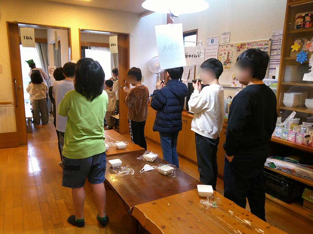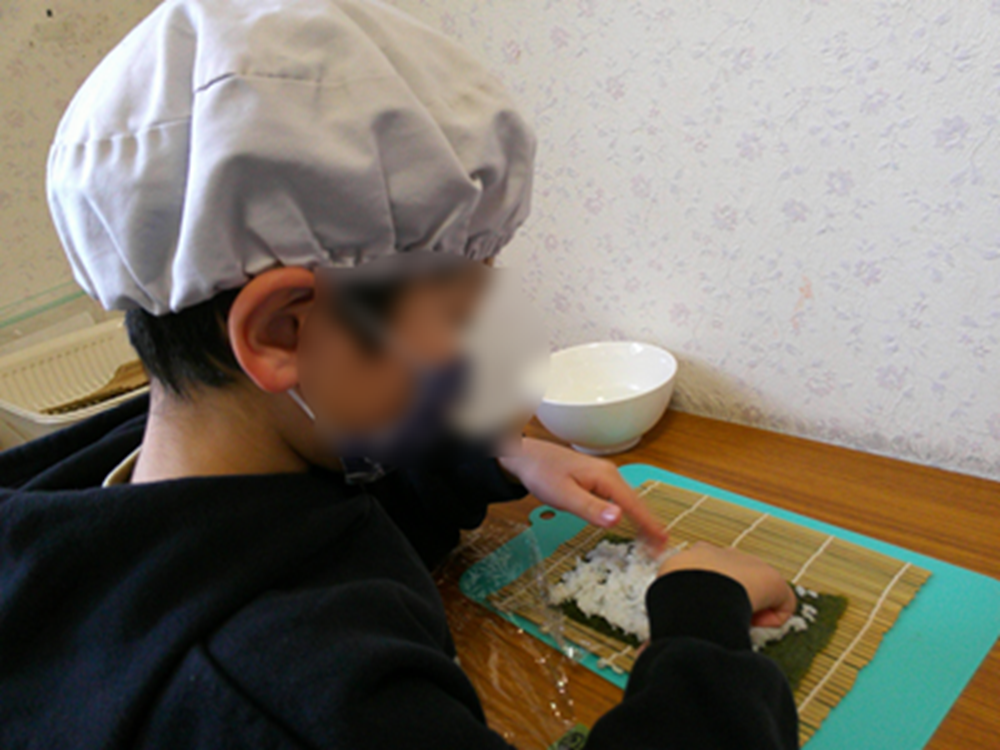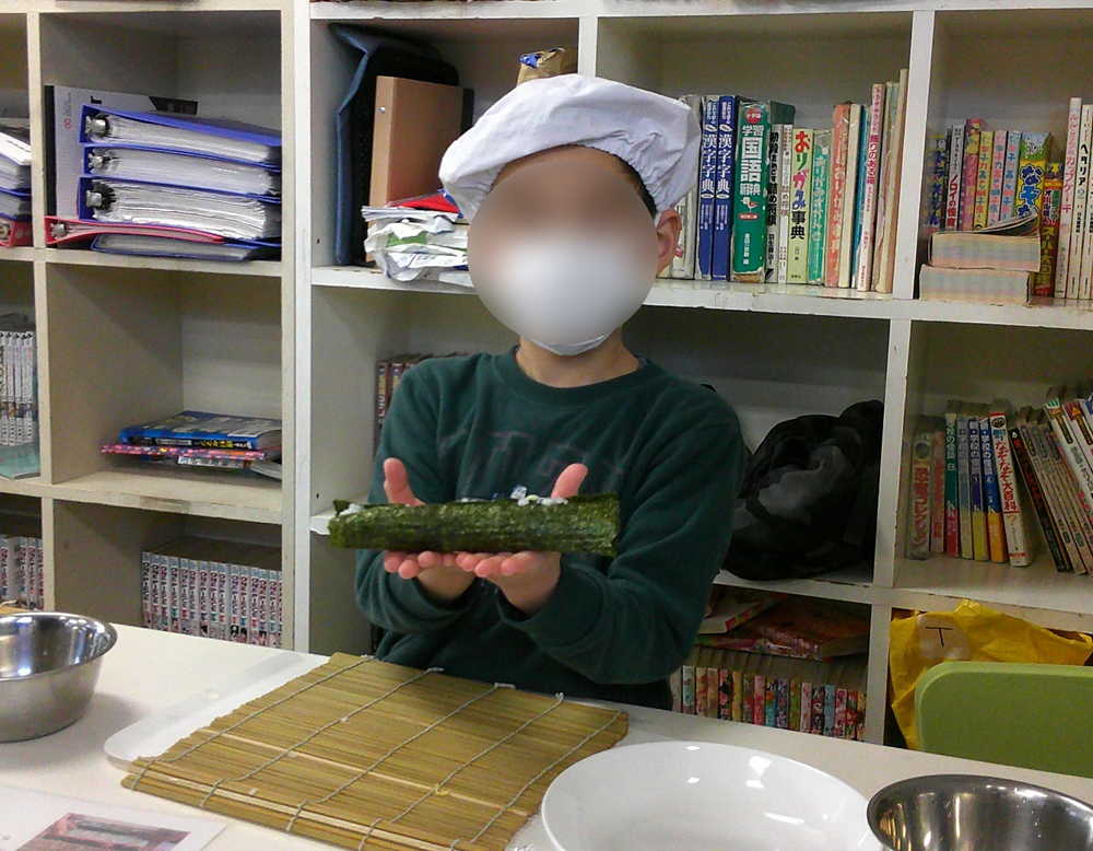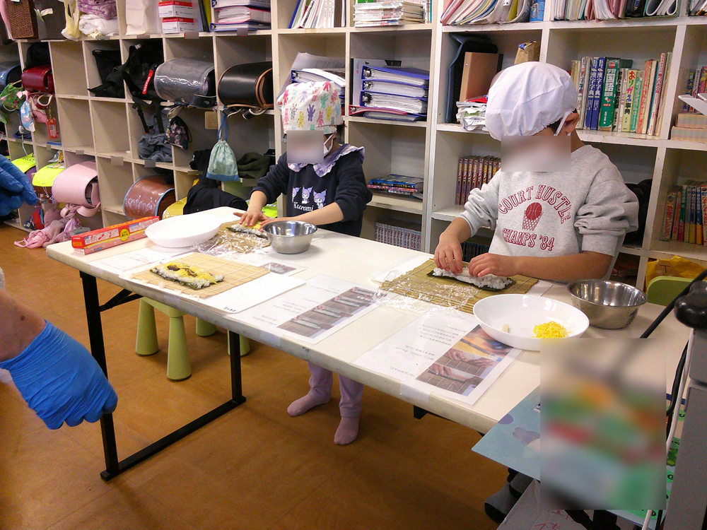 学童クラブでは、みんなで恵方巻(細巻き)を巻いておやつに食べました!